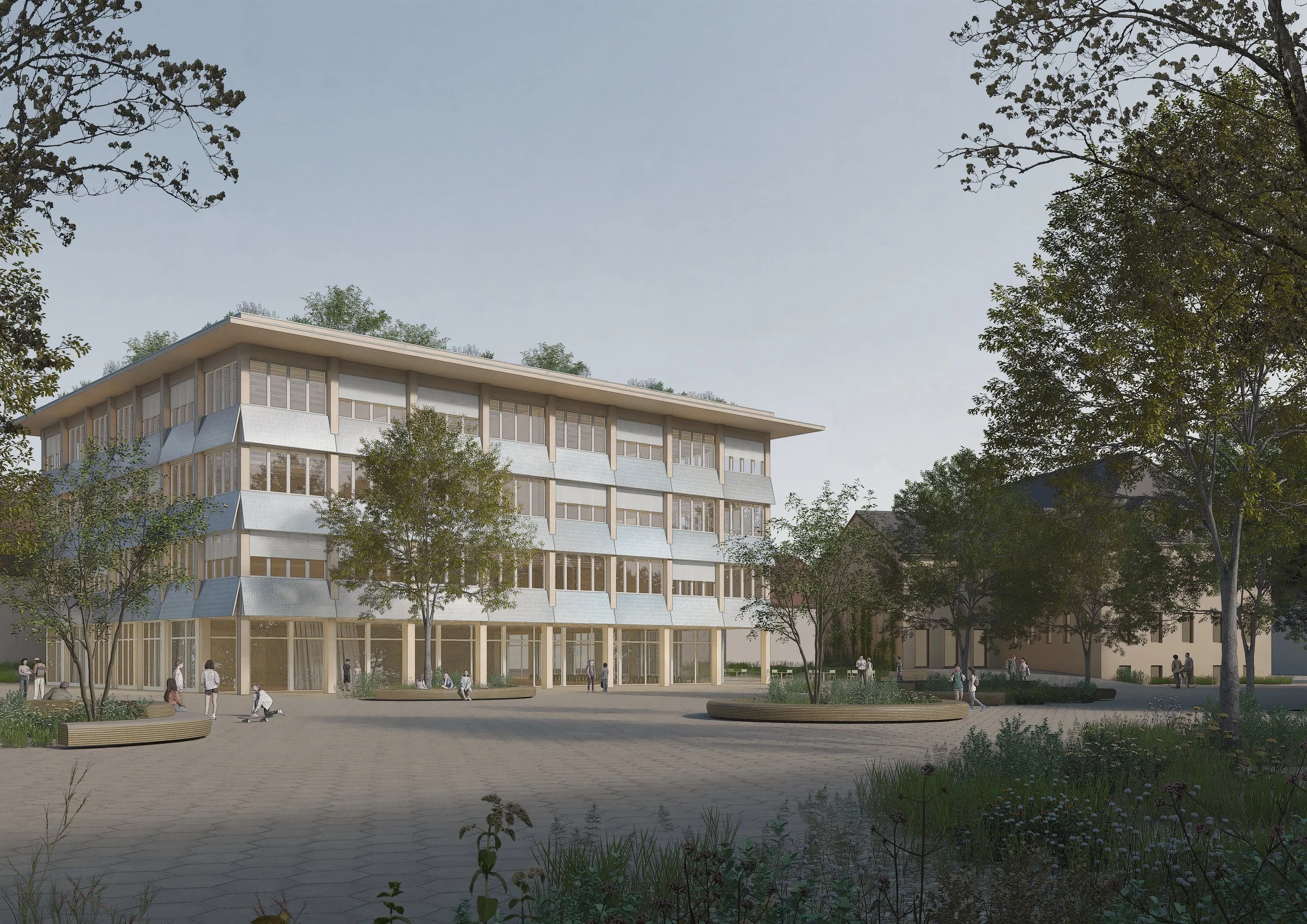 Die Architektur öffnet sich zur Campusmitte mit einer einladenden Aula, die Innen- und Außenräume verknüpft und vielfältige schulische wie öffentliche Nutzungen ermöglicht.